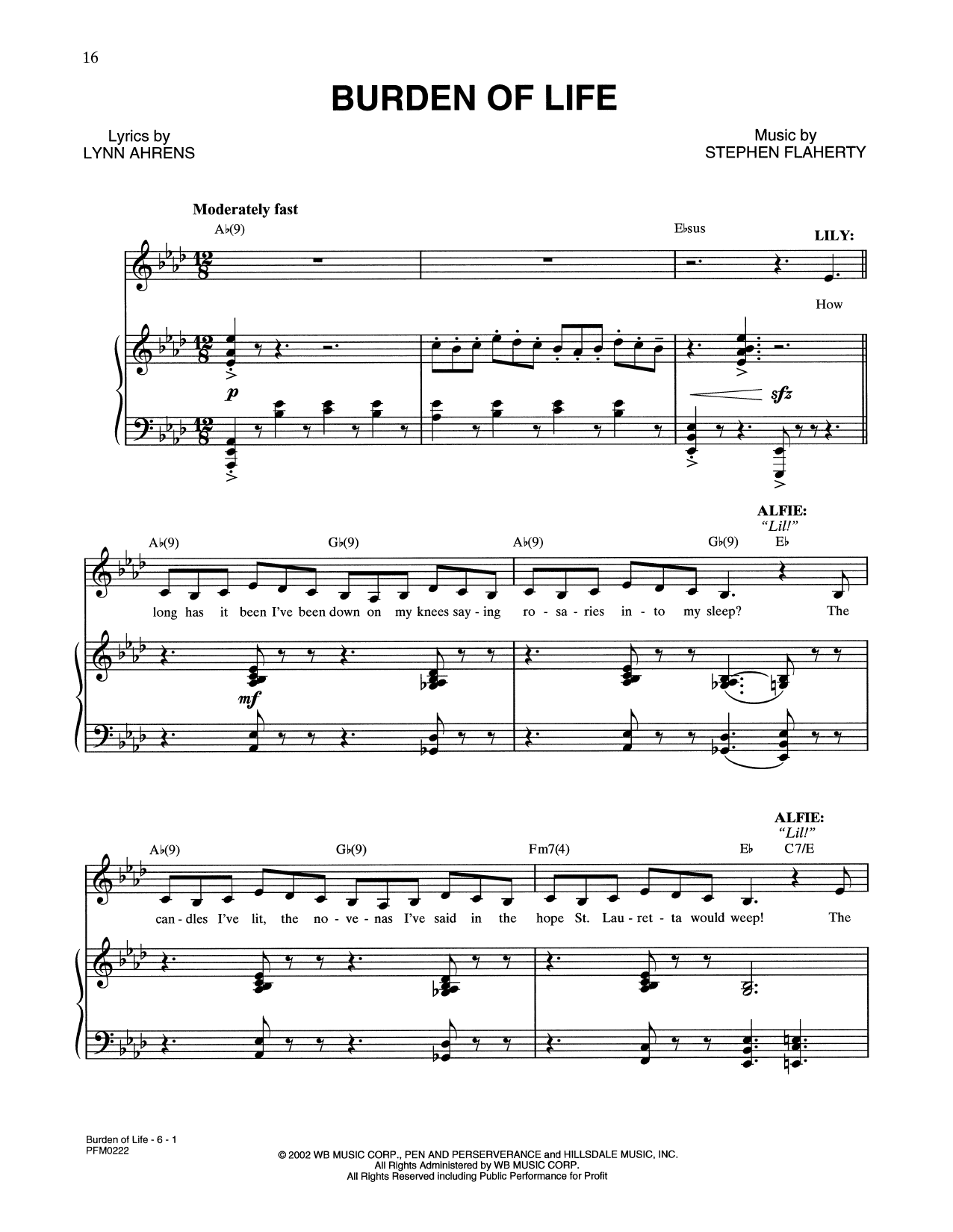 Download or print Lynn Ahrens and Stephen Flaherty Burden Of Life (from A Man Of No Importance: A New Musical) sheet music, chords and digital score arranged for Piano & Vocal. This Musical/Show score includes 6 page(s).