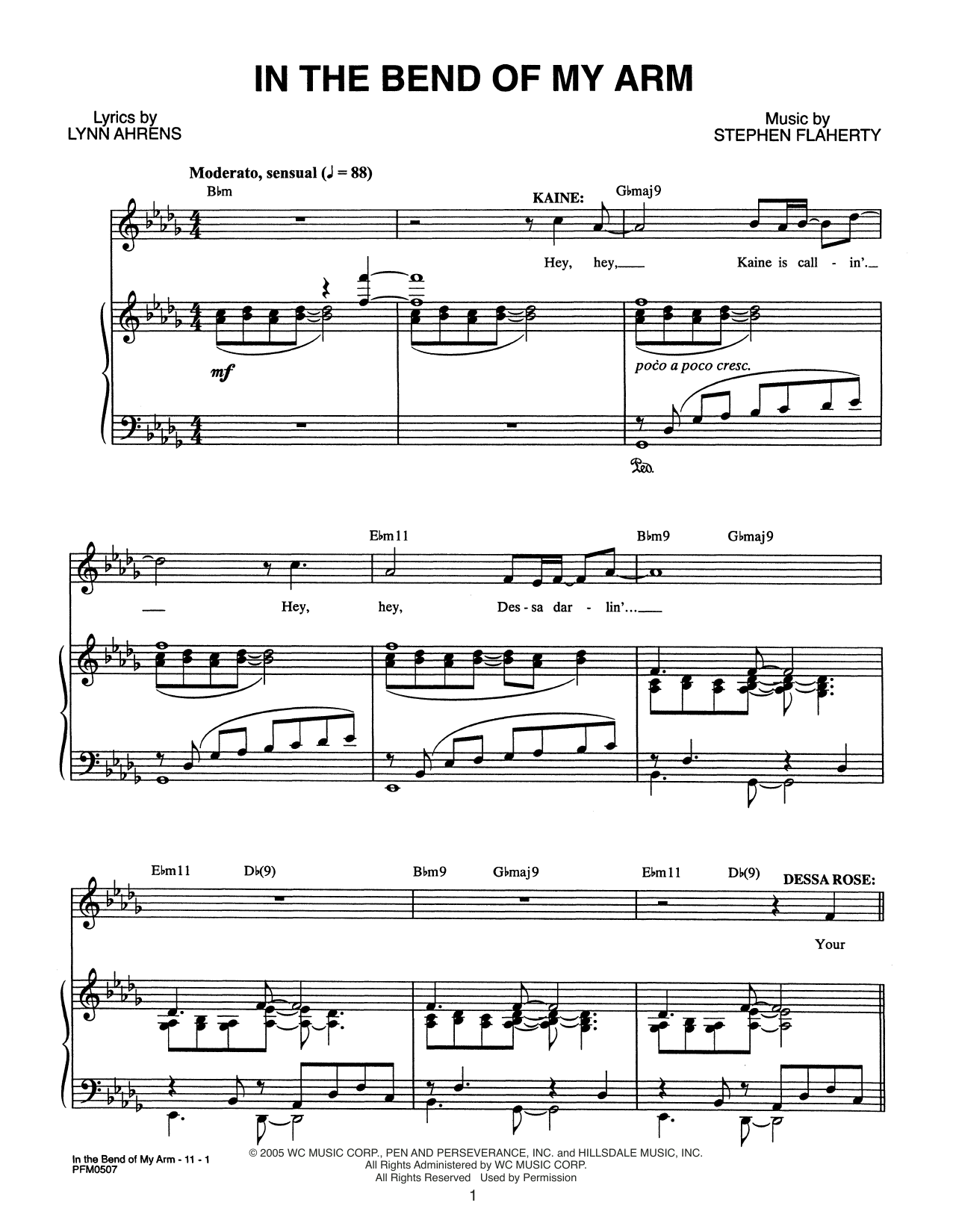 Download or print Lynn Ahrens and Stephen Flaherty In The Bend Of My Arm (from Dessa Rose: A New Musical) sheet music, chords and digital score arranged for Piano & Vocal. This Broadway score includes 11 page(s).