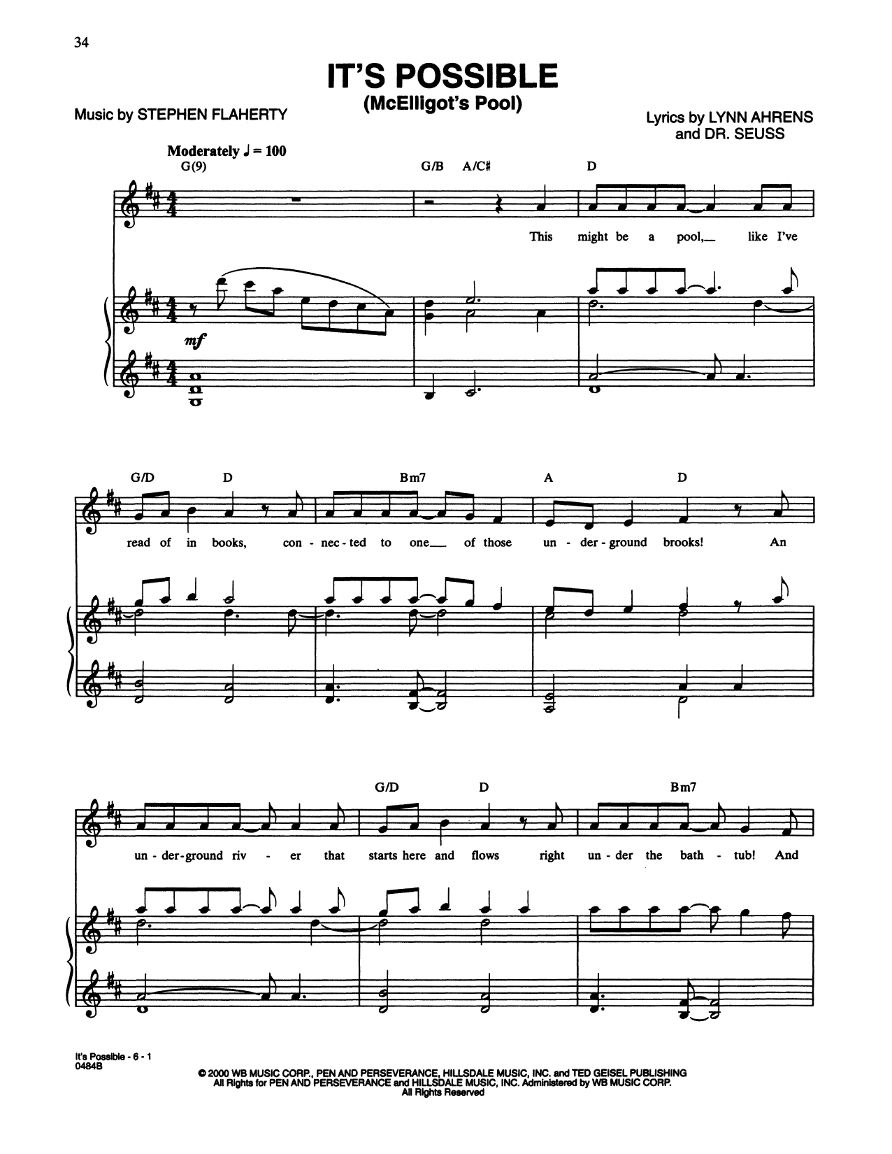 Download or print Lynn Ahrens and Stephen Flaherty It's Possible (In McElligot's Pool) (from Seussical The Musical) sheet music, chords and digital score arranged for Piano & Vocal. This Musical/Show score includes 6 page(s).