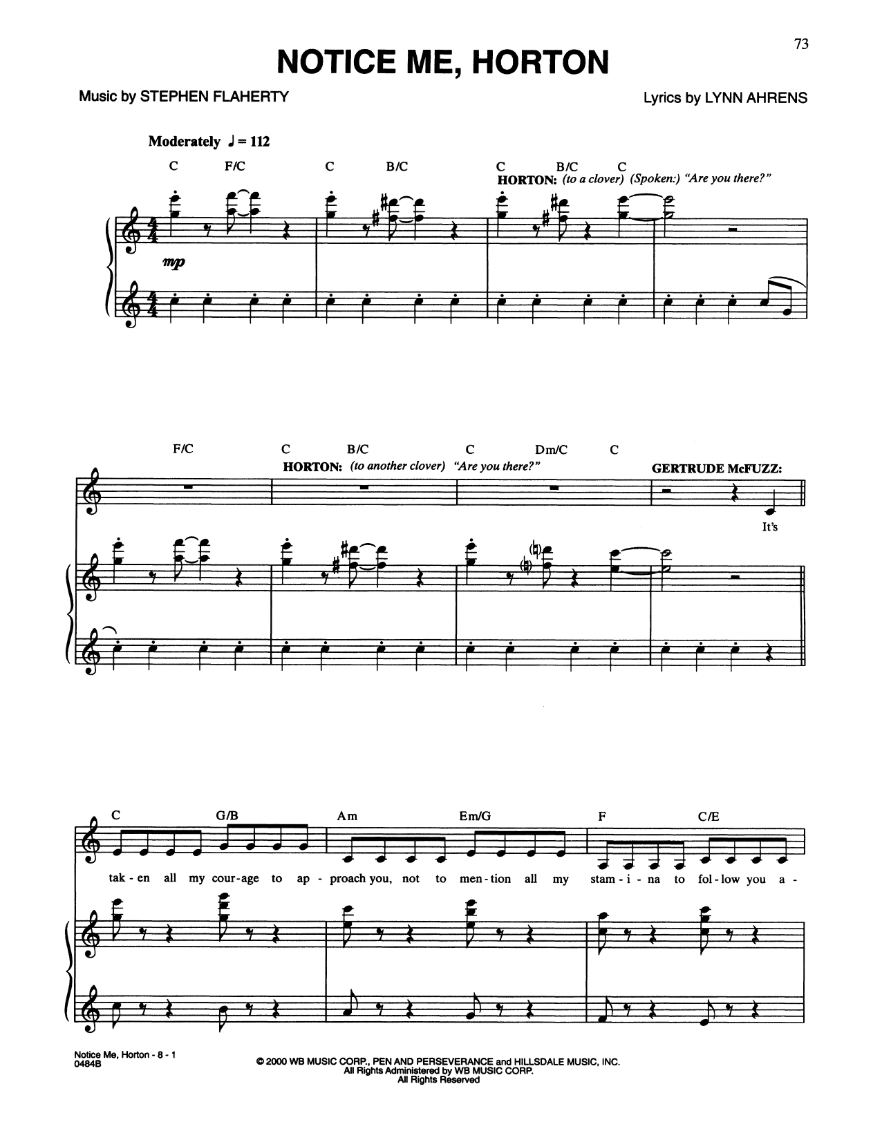 Download or print Lynn Ahrens and Stephen Flaherty Notice Me, Horton (from Seussical The Musical) sheet music, chords and digital score arranged for Piano & Vocal. This Musical/Show score includes 8 page(s).