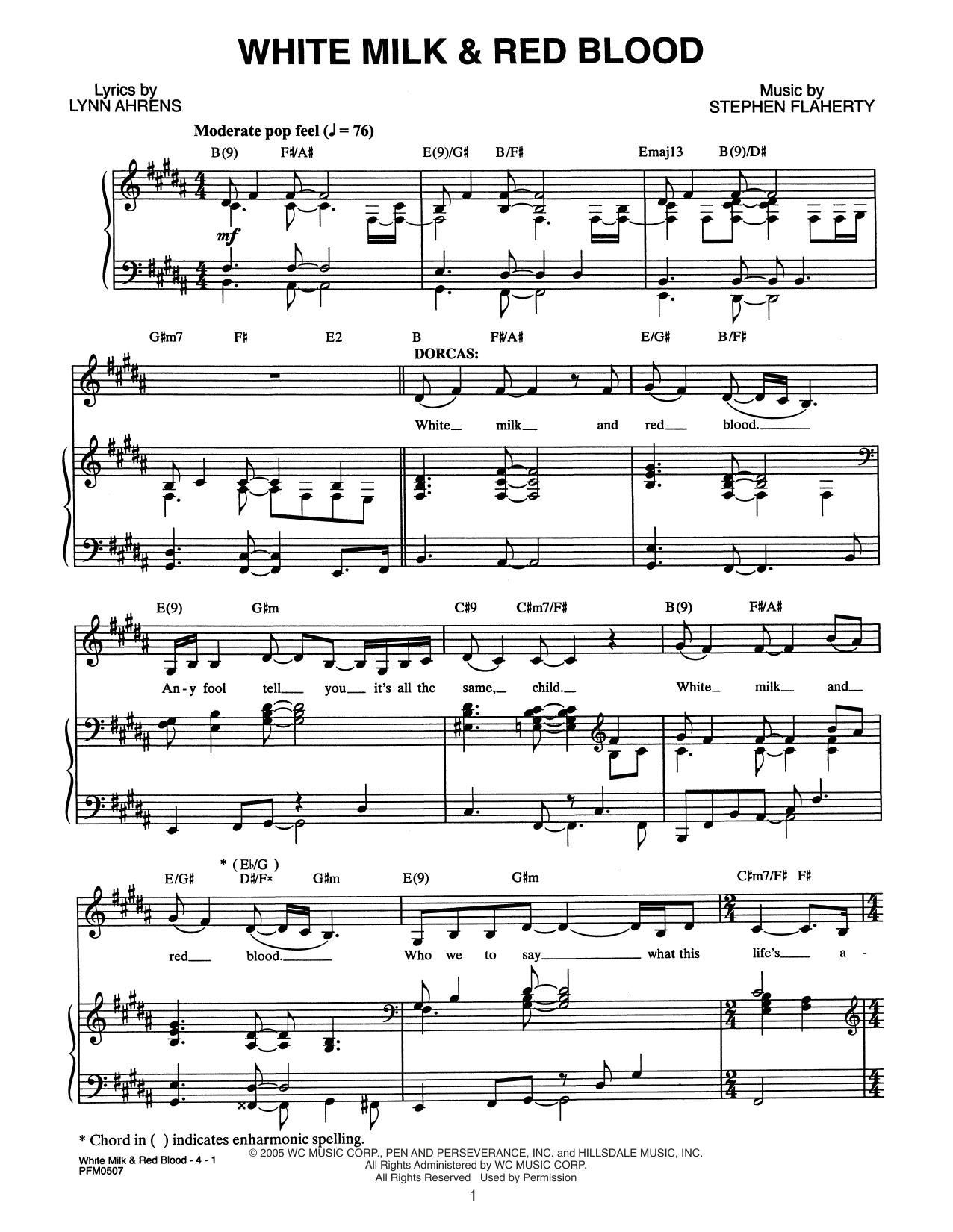 Download or print Lynn Ahrens and Stephen Flaherty White Milk & Red Blood (from Dessa Rose: A New Musical) sheet music, chords and digital score arranged for Piano & Vocal. This Broadway score includes 4 page(s).