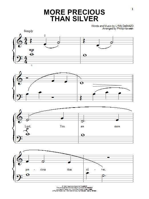 Download or print Lynn DeShazo More Precious Than Silver (arr. Phillip Keveren) sheet music, chords and digital score arranged for Beginning Piano Solo. This Children score includes 3 page(s).