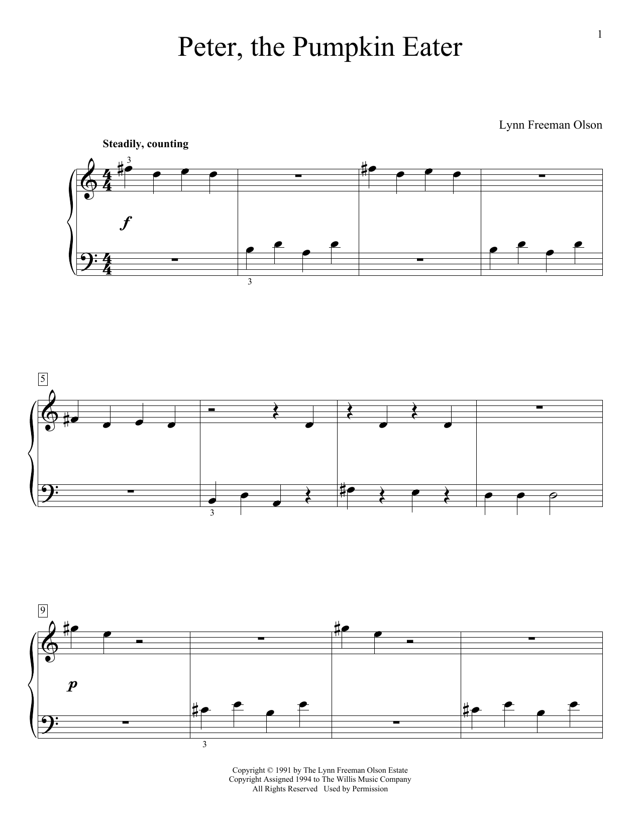 Download or print Lynn Freeman Olson Peter, The Pumpkin Eater sheet music, chords and digital score arranged for Educational Piano. This Instructional score includes 2 page(s).