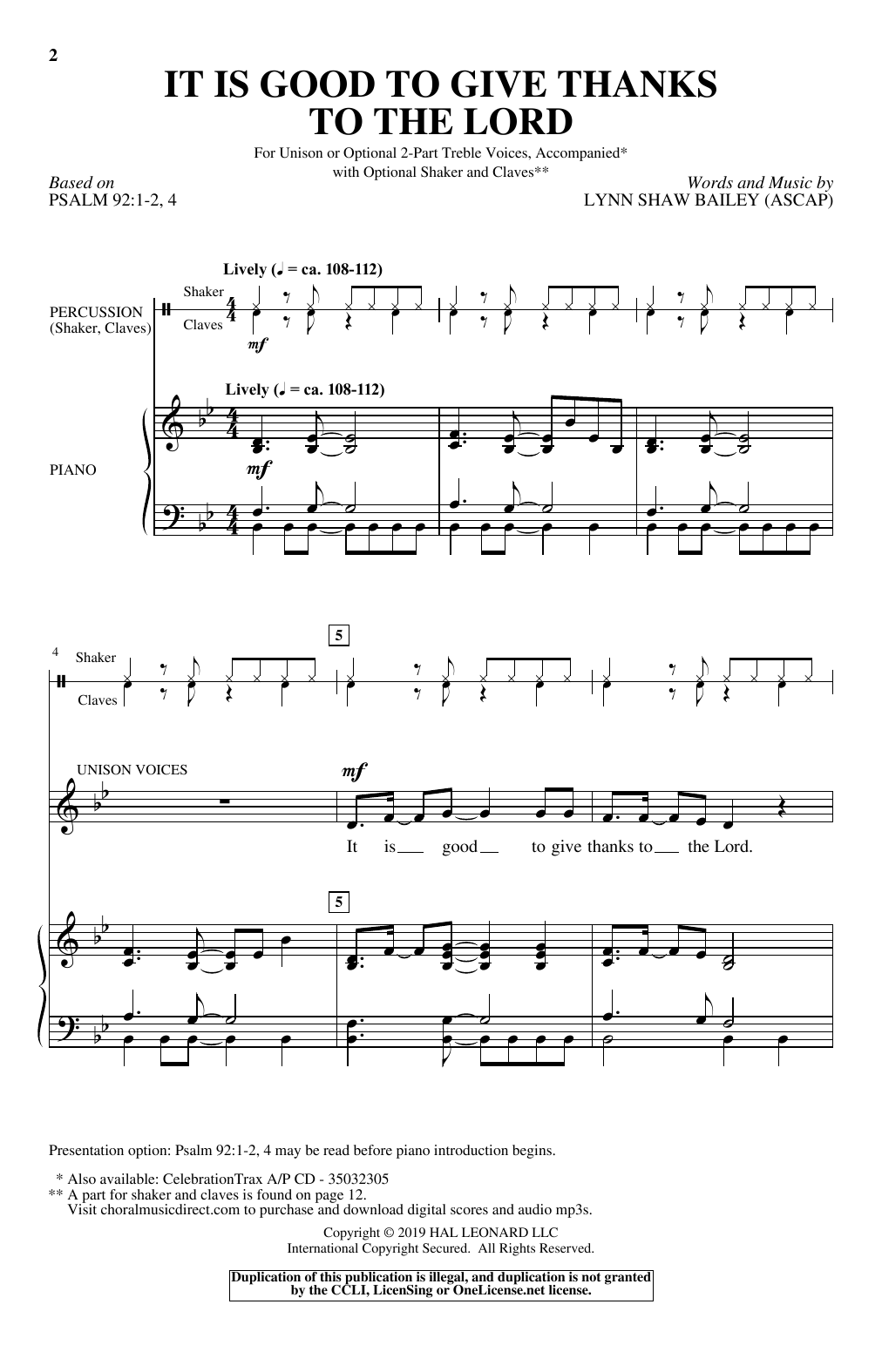 Download or print Lynn Shaw Bailey It Is Good To Give Thanks To The Lord sheet music, chords and digital score arranged for Unison Choir. This Concert score includes 11 page(s).