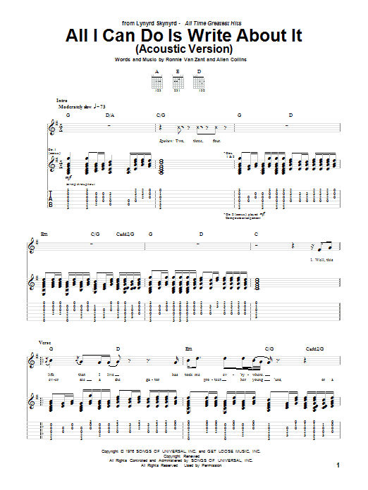 Download or print Lynyrd Skynyrd All I Can Do Is Write About It sheet music, chords and digital score arranged for Guitar Tab. This Country score includes 5 page(s).
