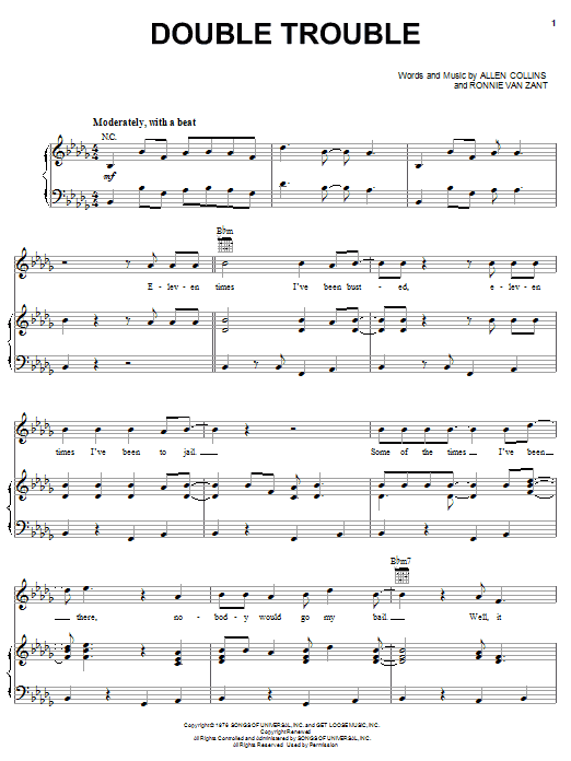 Download or print Lynyrd Skynyrd Double Trouble sheet music, chords and digital score arranged for Piano, Vocal & Guitar Chords (Right-Hand Melody). This Country score includes 5 page(s).