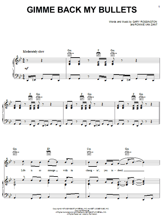 Download or print Lynyrd Skynyrd Gimme Back My Bullets sheet music, chords and digital score arranged for Easy Guitar Tab. This Pop score includes 3 page(s).