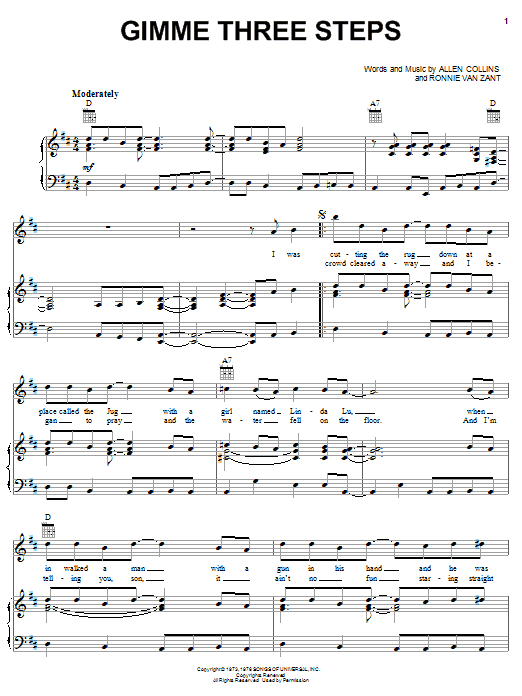 Download or print Lynyrd Skynyrd Gimme Three Steps sheet music, chords and digital score arranged for Bass Guitar Tab. This Country score includes 8 page(s).