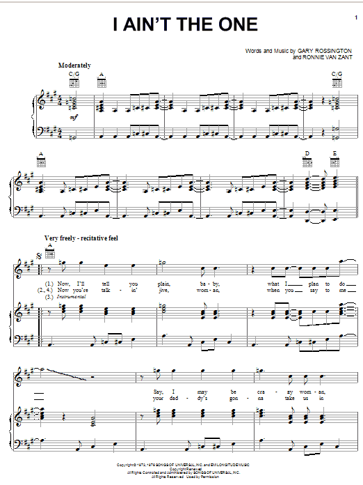 Download or print Lynyrd Skynyrd I Ain't The One sheet music, chords and digital score arranged for Piano, Vocal & Guitar Chords (Right-Hand Melody). This Country score includes 3 page(s).
