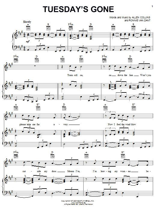 Download or print Lynyrd Skynyrd Tuesday's Gone sheet music, chords and digital score arranged for Guitar Tab. This Country score includes 8 page(s).