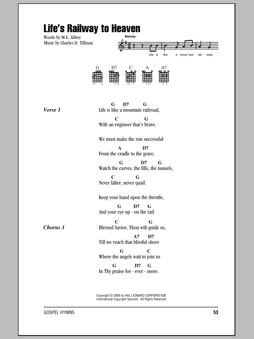 Download or print M.E. Abbey Life's Railway To Heaven sheet music, chords and digital score arranged for Piano, Vocal & Guitar Chords (Right-Hand Melody). This Gospel score includes 2 page(s).