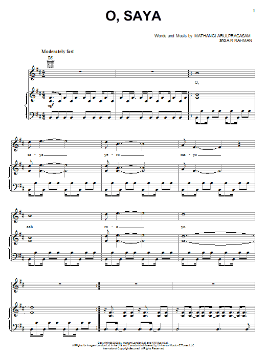 Download or print M.I.A. O, Saya sheet music, chords and digital score arranged for Piano, Vocal & Guitar Chords (Right-Hand Melody). This Film/TV score includes 9 page(s).