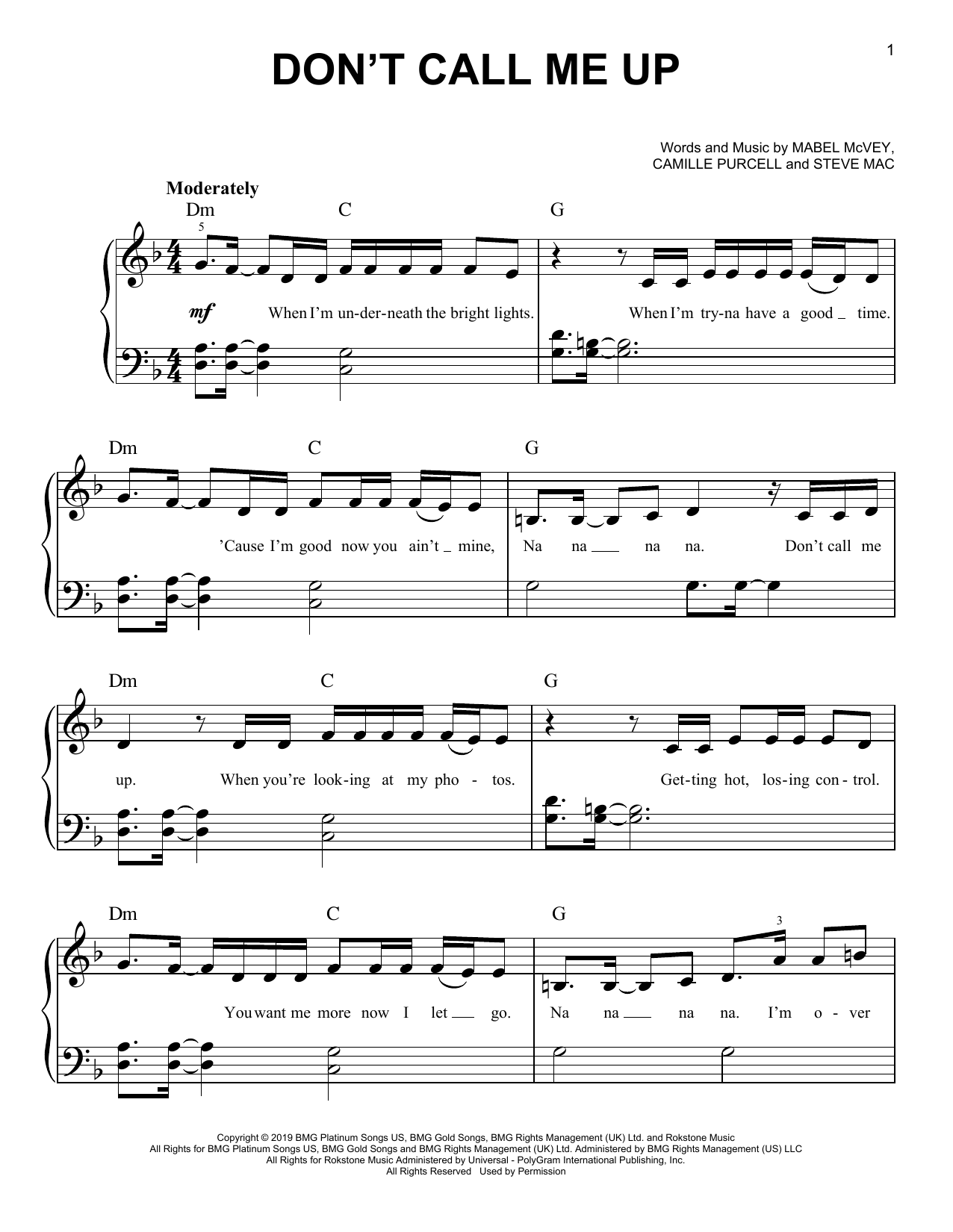 Download or print Mabel Don't Call Me Up sheet music, chords and digital score arranged for Really Easy Piano. This Pop score includes 4 page(s).