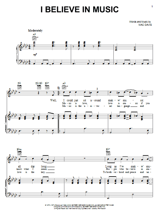 Download or print Mac Davis I Believe In Music sheet music, chords and digital score arranged for Lead Sheet / Fake Book. This Country score includes 1 page(s).