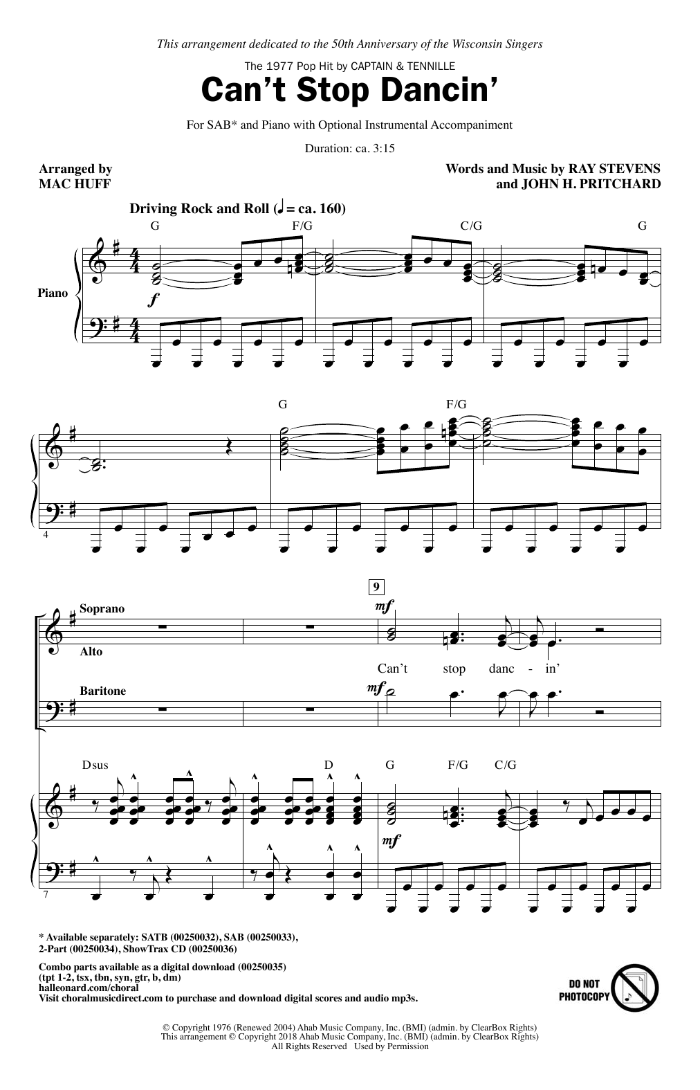 Download or print Mac Huff Can't Stop Dancin' sheet music, chords and digital score arranged for SAB Choir. This Pop score includes 14 page(s).