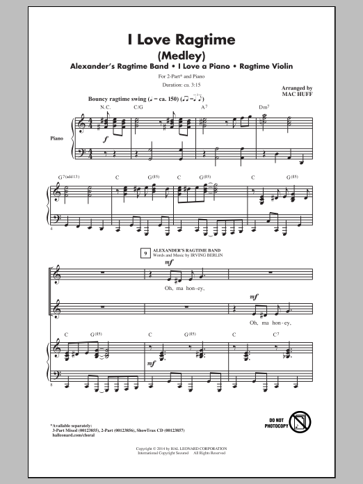 Download or print Mac Huff I Love Ragtime (Medley) sheet music, chords and digital score arranged for 2-Part Choir. This Jazz score includes 4 page(s).