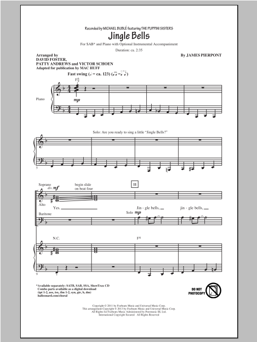 Download or print Mac Huff Jingle Bells sheet music, chords and digital score arranged for SAB Choir. This Christmas score includes 14 page(s).