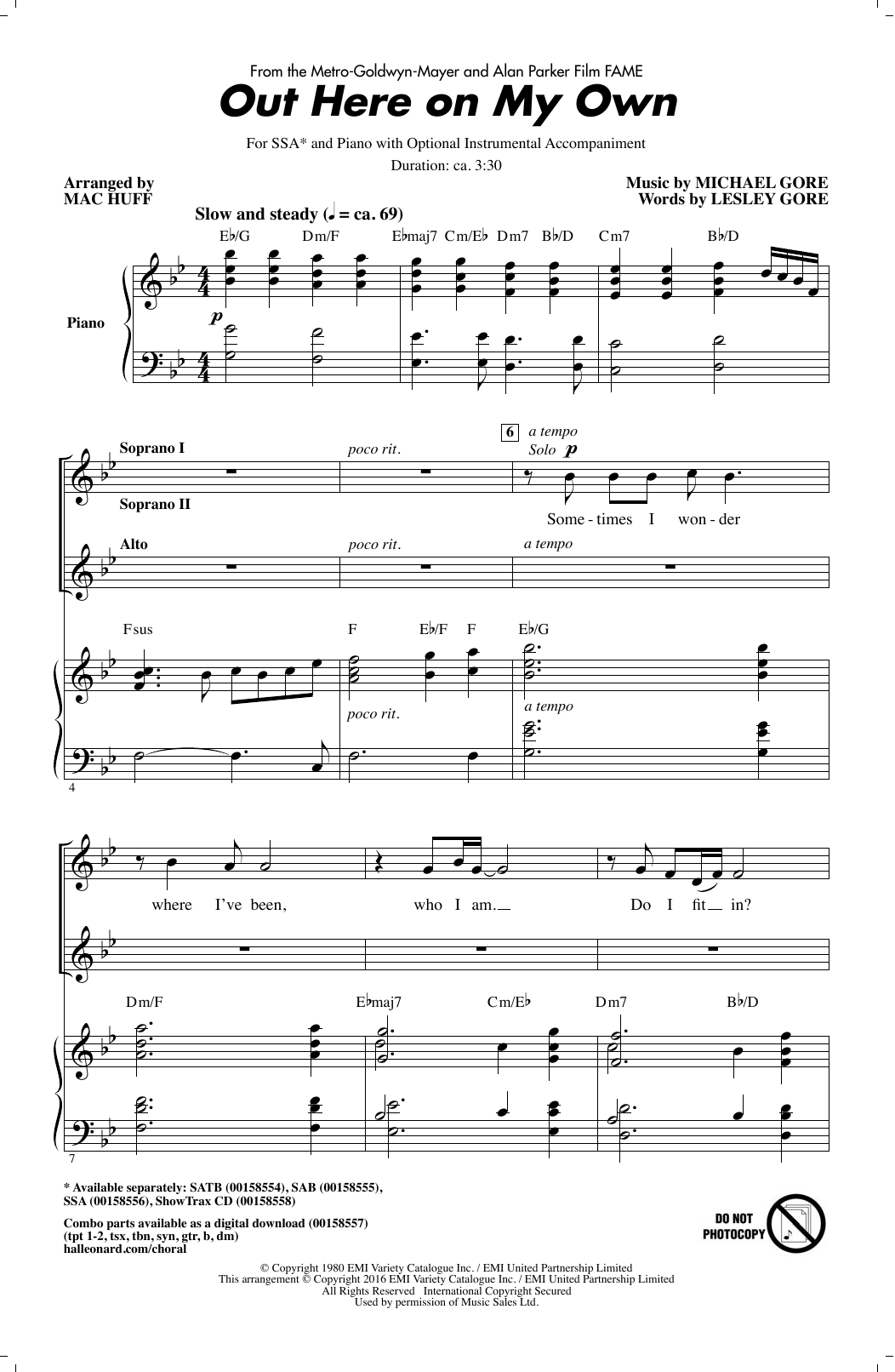 Download or print Michael Gore Out Here On My Own (from Fame) (arr. Mac Huff) sheet music, chords and digital score arranged for SAB Choir. This Film/TV score includes 7 page(s).