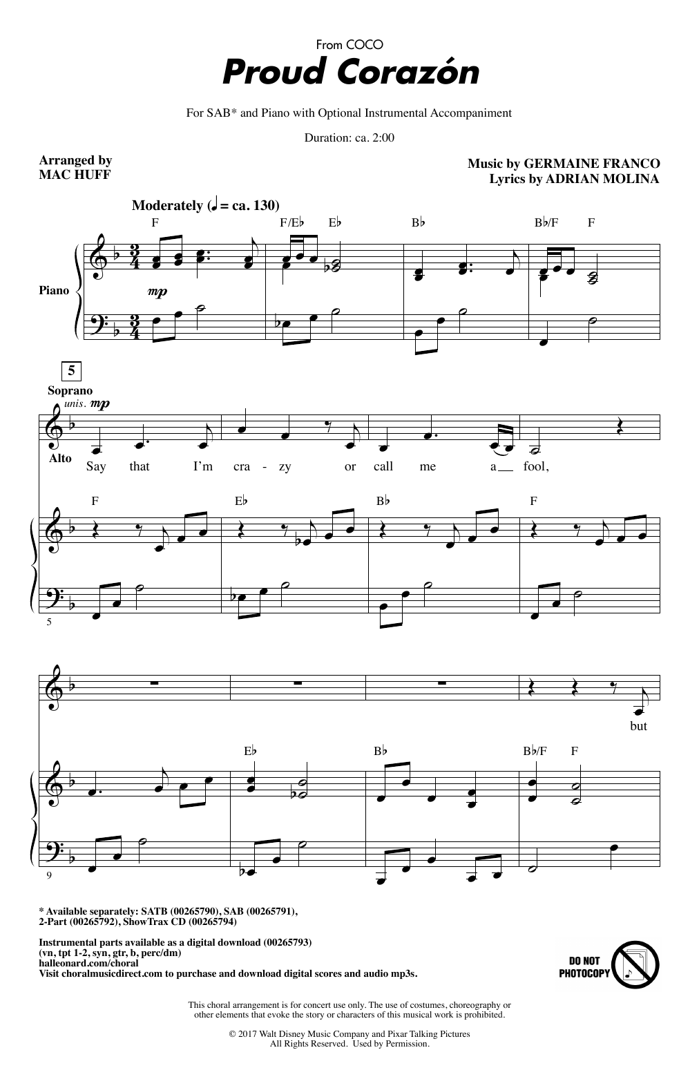 Download or print Germaine Franco & Adrian Molina Proud Corazon (from Coco) (arr. Mac Huff) sheet music, chords and digital score arranged for SAB Choir. This Children score includes 8 page(s).