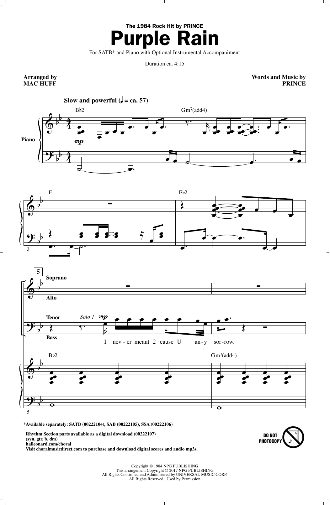 Download or print Prince Purple Rain (arr. Mac Huff) sheet music, chords and digital score arranged for SAB Choir. This Pop score includes 10 page(s).