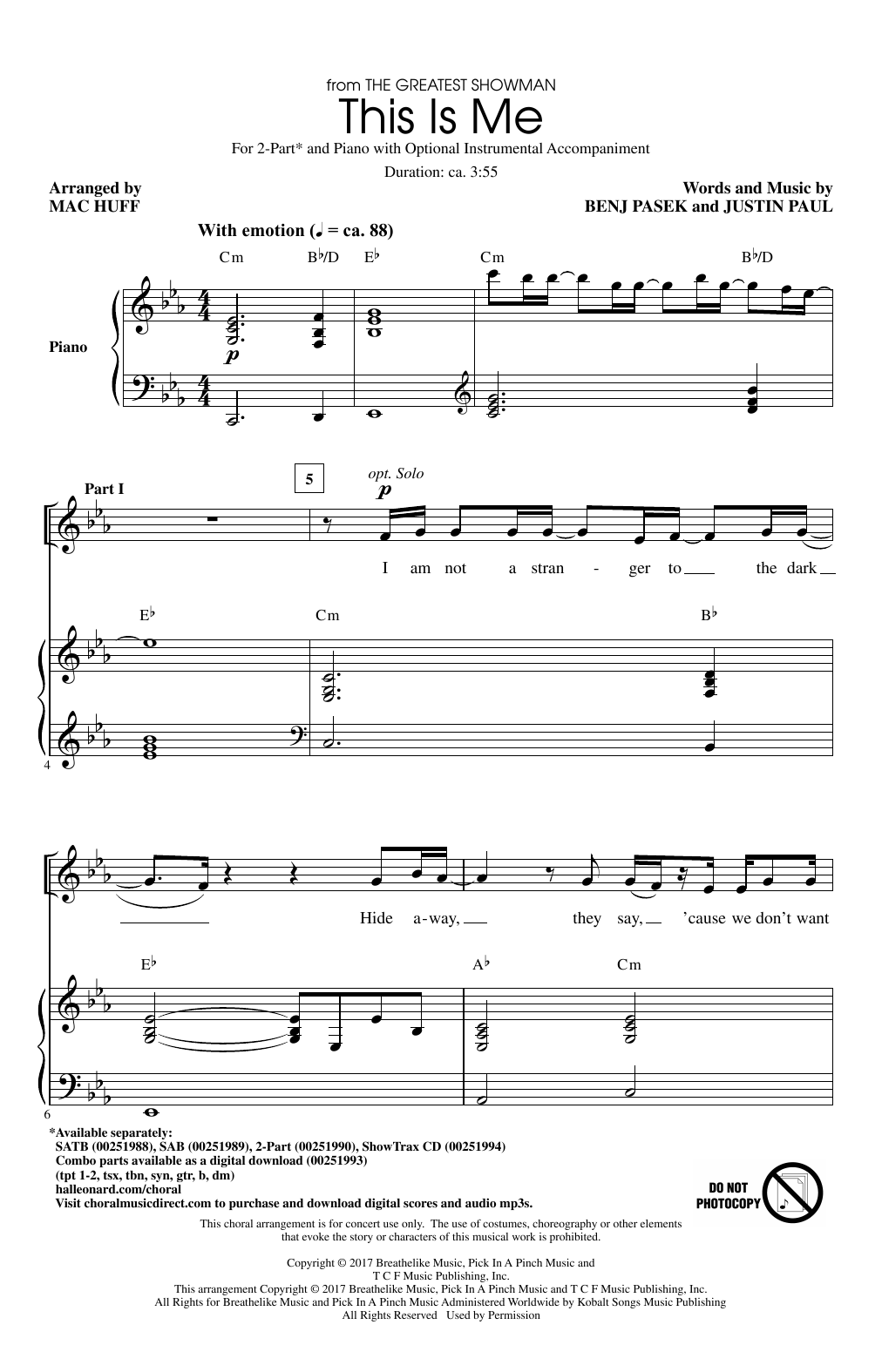 Download or print Pasek & Paul This Is Me (from The Greatest Showman) (arr. Mac Huff) sheet music, chords and digital score arranged for 2-Part Choir. This Film/TV score includes 15 page(s).