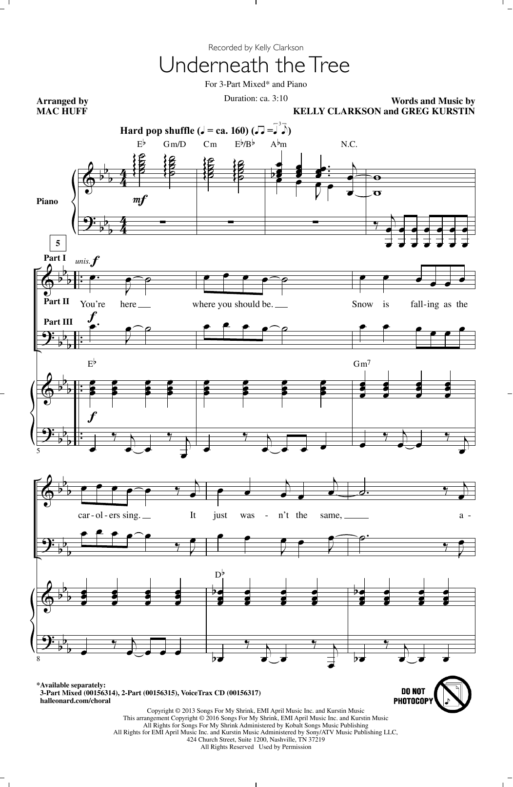 Download or print Kelly Clarkson Underneath The Tree (arr. Mac Huff) sheet music, chords and digital score arranged for 3-Part Mixed Choir. This Christmas score includes 10 page(s).