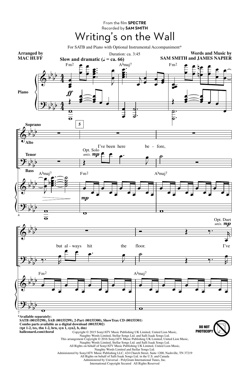Download or print Sam Smith Writing's On The Wall (arr. Mac Huff) sheet music, chords and digital score arranged for SAB Choir. This Pop score includes 9 page(s).