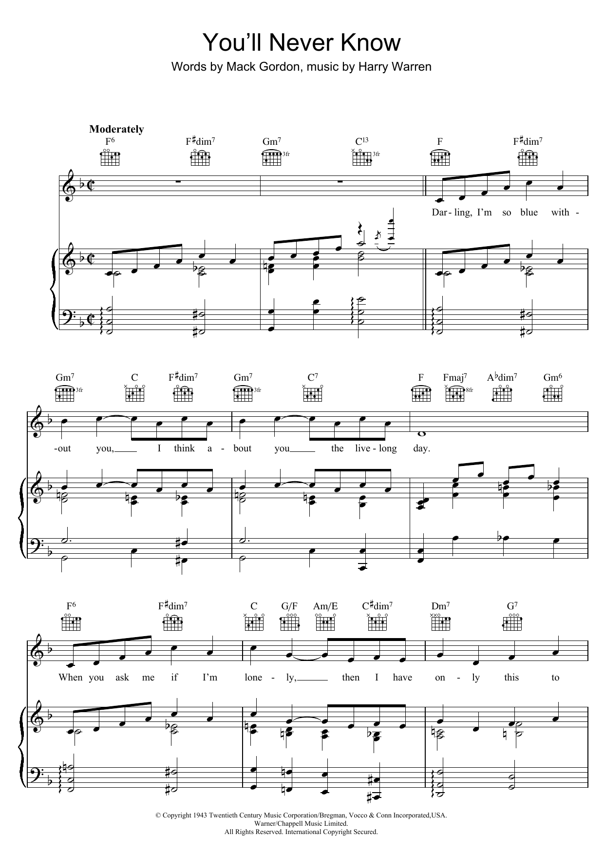 Download or print Mack Gordon You'll Never Know sheet music, chords and digital score arranged for Piano, Vocal & Guitar Chords. This Standards score includes 5 page(s).