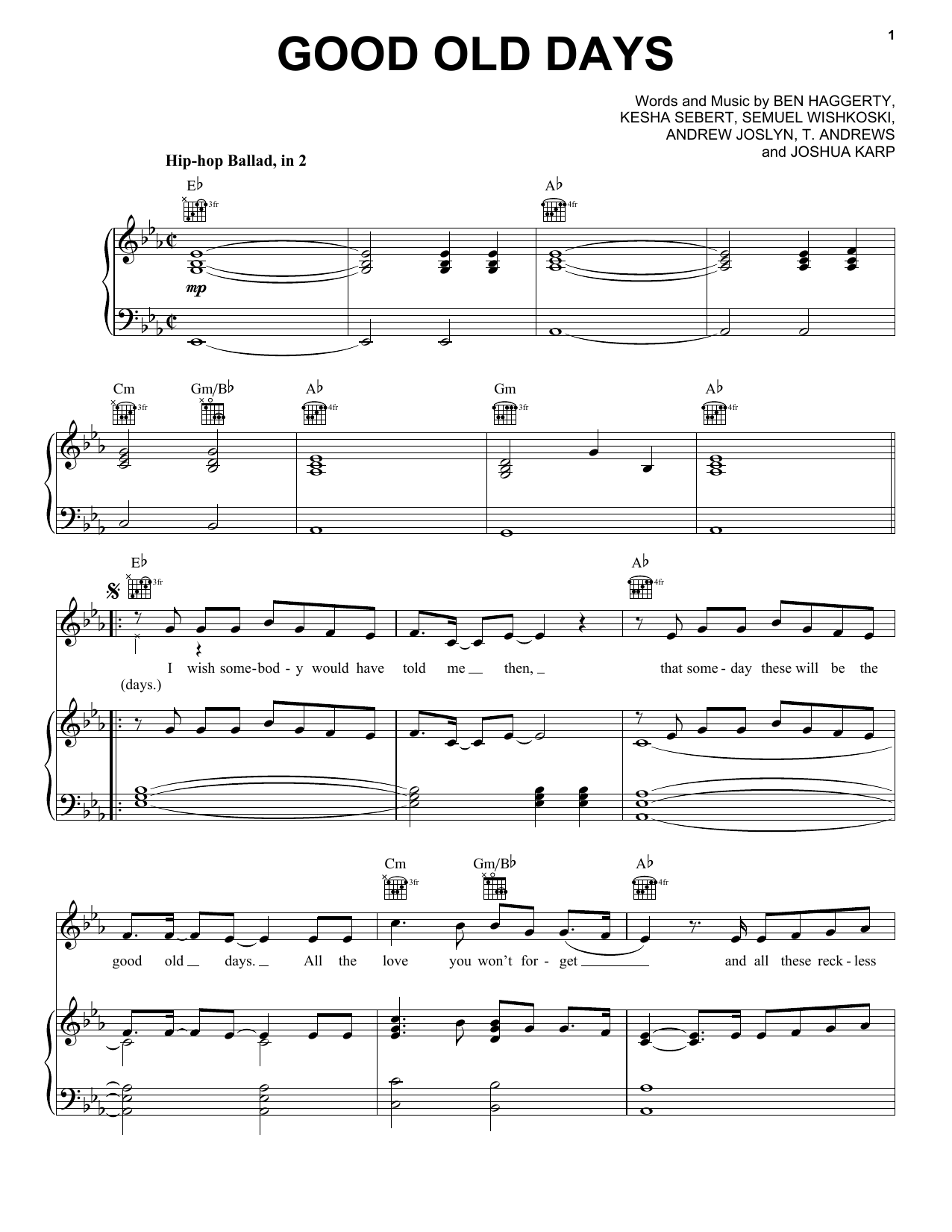 Download or print Macklemore feat. Kesha Good Old Days sheet music, chords and digital score arranged for Piano, Vocal & Guitar Chords (Right-Hand Melody). This Pop score includes 7 page(s).