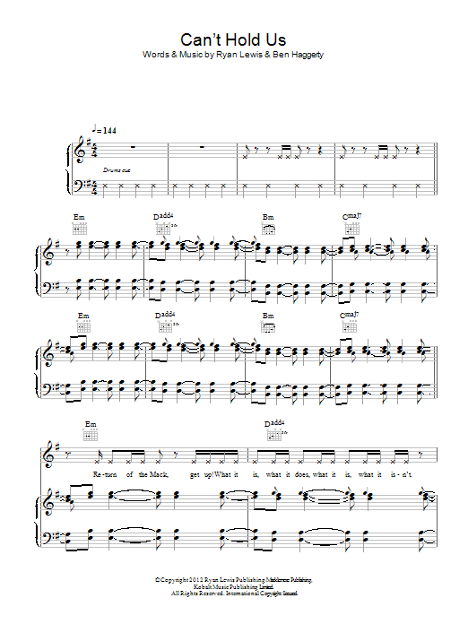 Download or print Macklemore and Ryan Lewis Can't Hold Us sheet music, chords and digital score arranged for Piano, Vocal & Guitar Chords. This Pop score includes 10 page(s).