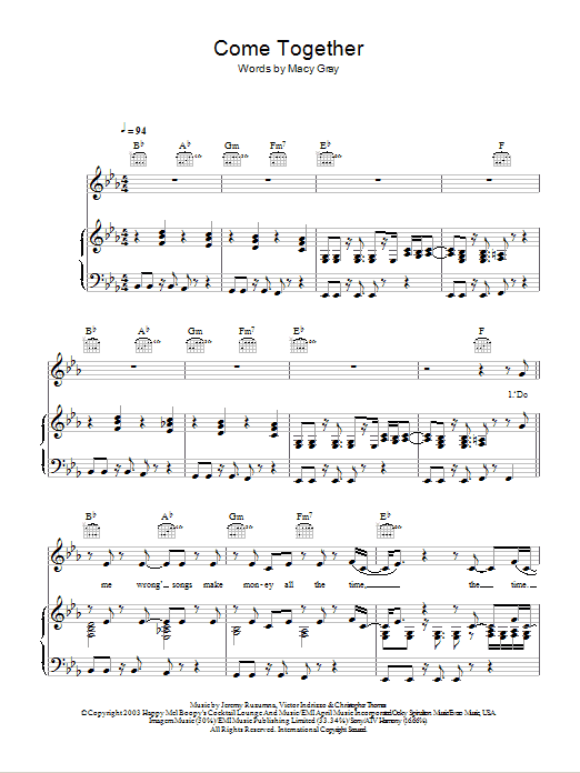 Download or print Macy Gray Come Together sheet music, chords and digital score arranged for Piano, Vocal & Guitar Chords. This Pop score includes 9 page(s).