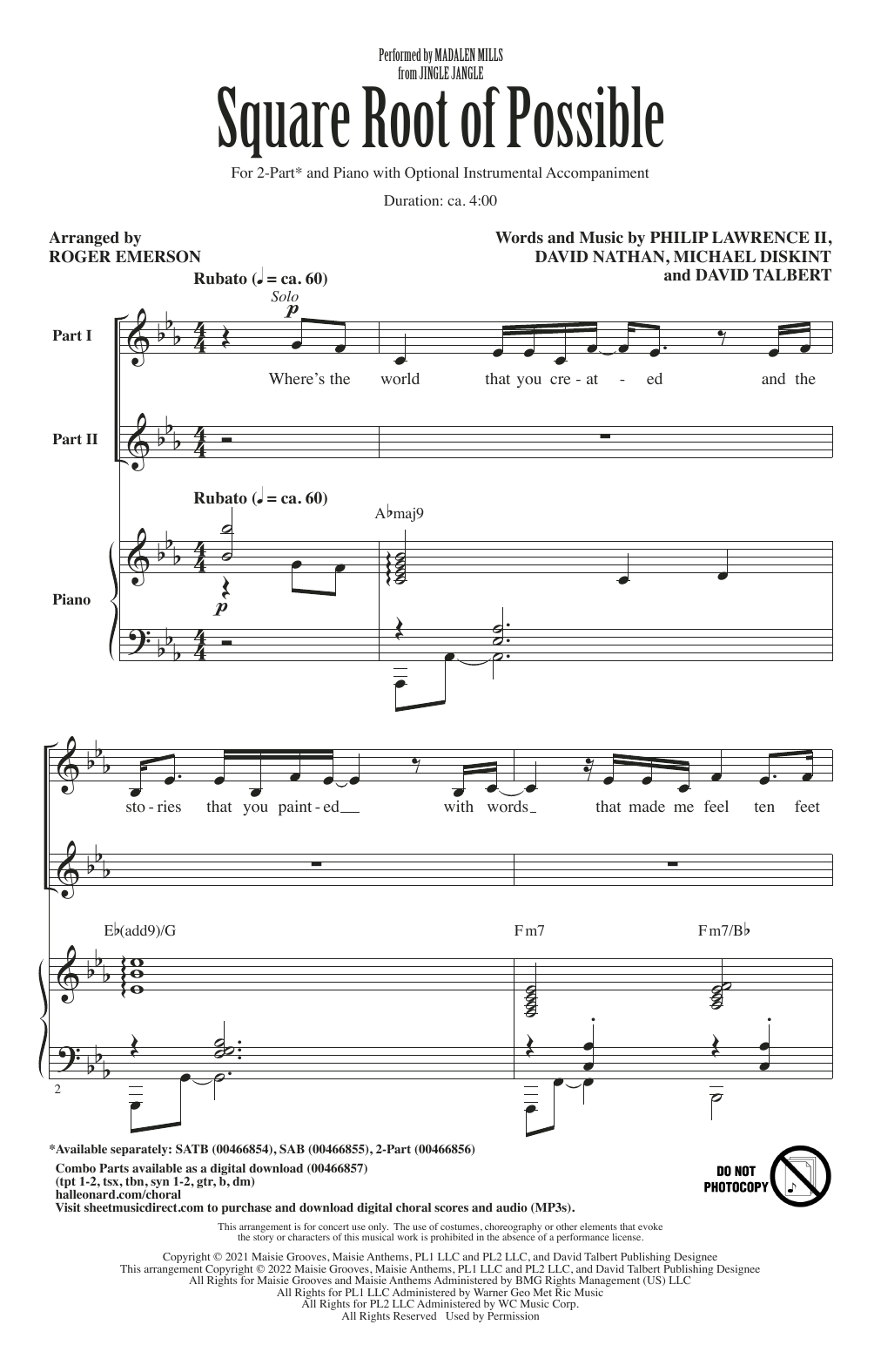 Download or print Madalen Mills Square Root Of Possible (from Jingle Jangle) (arr. Roger Emerson) sheet music, chords and digital score arranged for SAB Choir. This Children score includes 13 page(s).