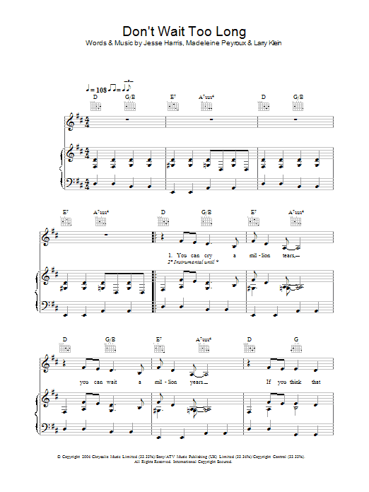 Download or print Madeleine Peyroux Don't Wait Too Long sheet music, chords and digital score arranged for Piano, Vocal & Guitar Chords. This Jazz score includes 4 page(s).