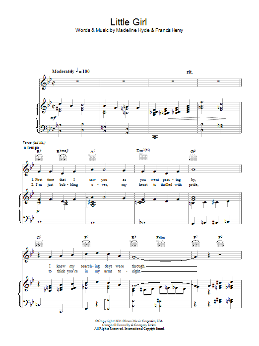 Download or print Madeline Hyde Little Girl sheet music, chords and digital score arranged for Piano, Vocal & Guitar Chords. This Oldies score includes 4 page(s).