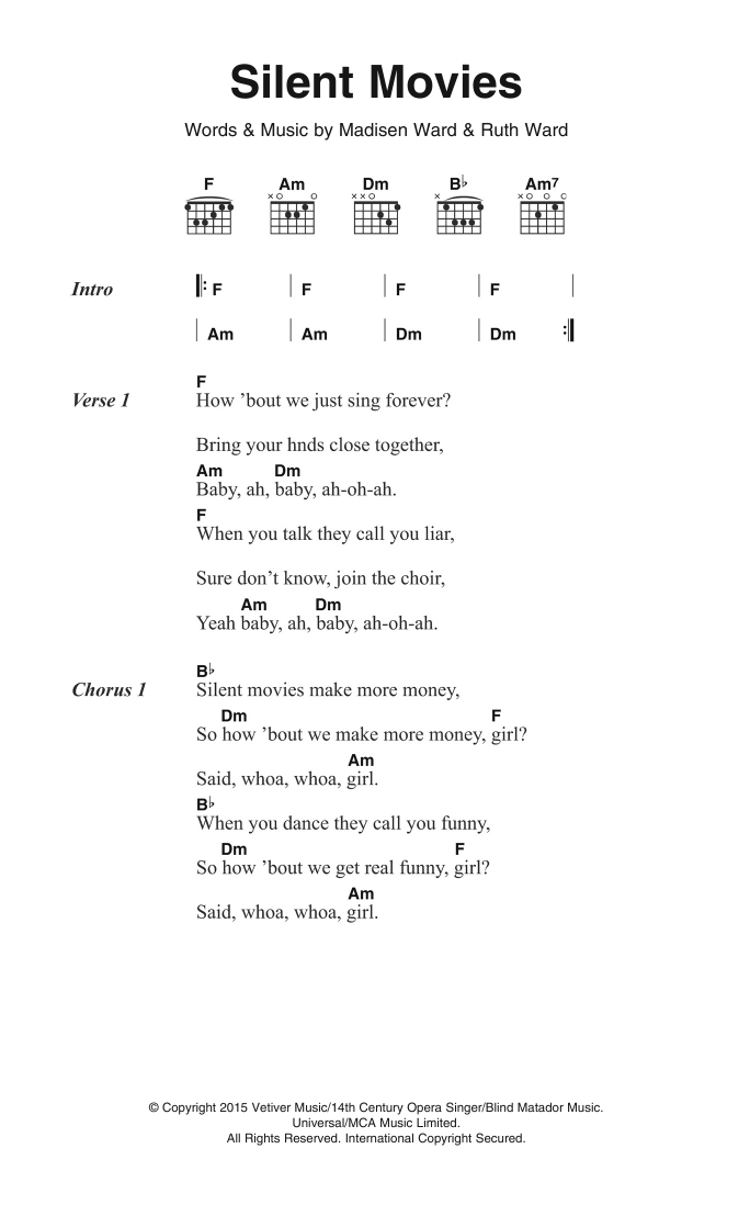 Download or print Madisen Ward and the Mama Bear Silent Movies sheet music, chords and digital score arranged for Guitar Chords/Lyrics. This Pop score includes 2 page(s).