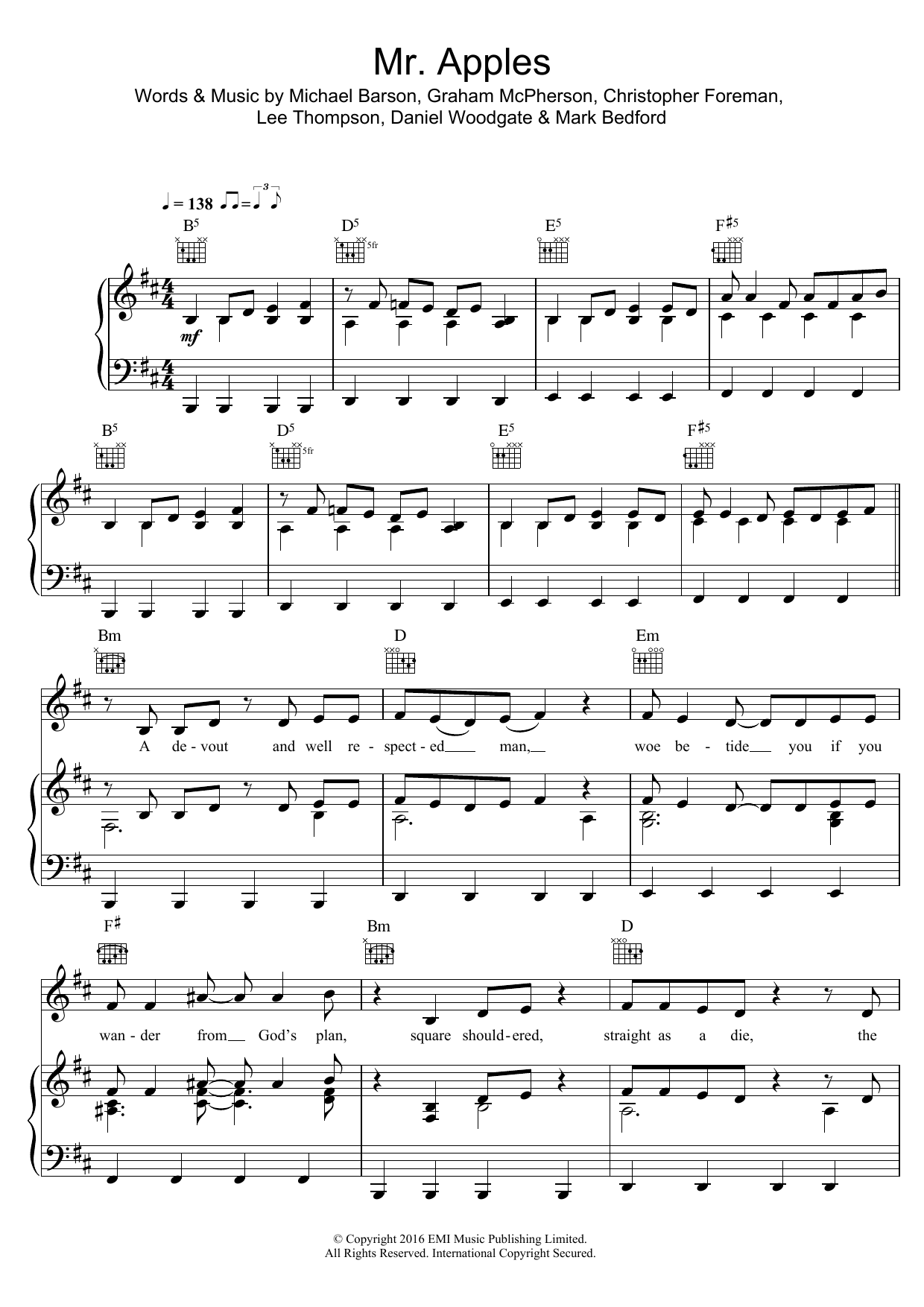 Download or print Madness Mr Apples sheet music, chords and digital score arranged for Piano, Vocal & Guitar Chords. This Pop score includes 8 page(s).