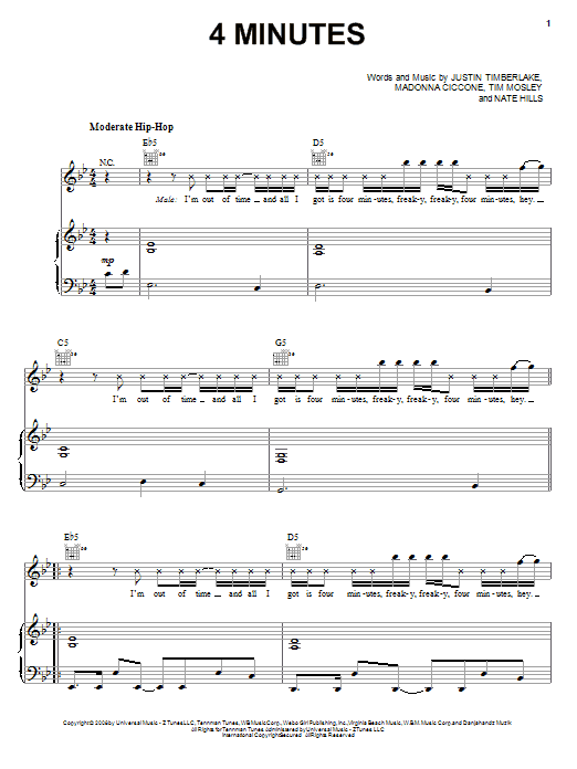 Download or print Madonna featuring Justin Timberlake 4 Minutes sheet music, chords and digital score arranged for Piano, Vocal & Guitar Chords (Right-Hand Melody). This Pop score includes 9 page(s).