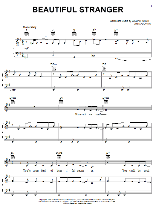 Download or print Madonna Beautiful Stranger sheet music, chords and digital score arranged for Lead Sheet / Fake Book. This Pop score includes 2 page(s).