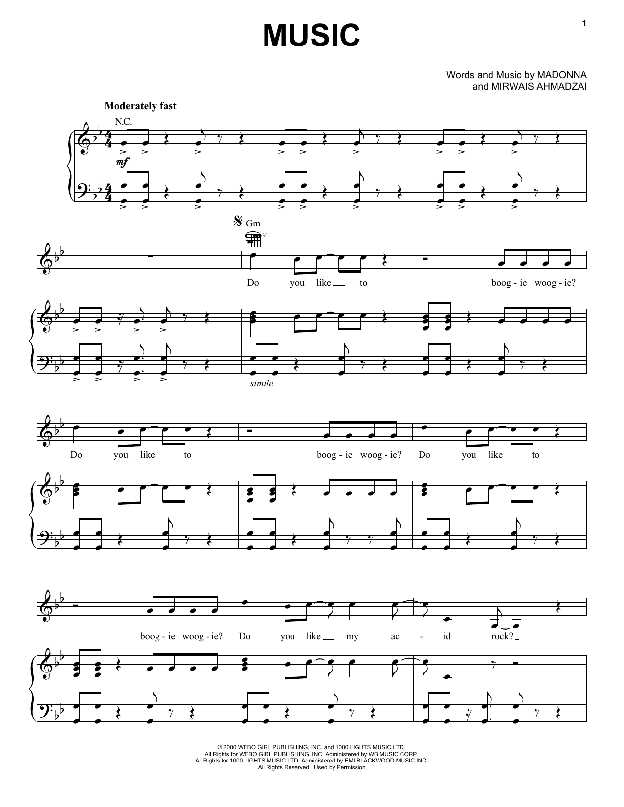 Download or print Madonna Music sheet music, chords and digital score arranged for Piano, Vocal & Guitar Chords (Right-Hand Melody). This Pop score includes 4 page(s).