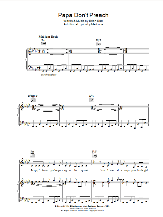 Download or print Madonna Papa Don't Preach sheet music, chords and digital score arranged for Piano, Vocal & Guitar Chords (Right-Hand Melody). This Pop score includes 6 page(s).