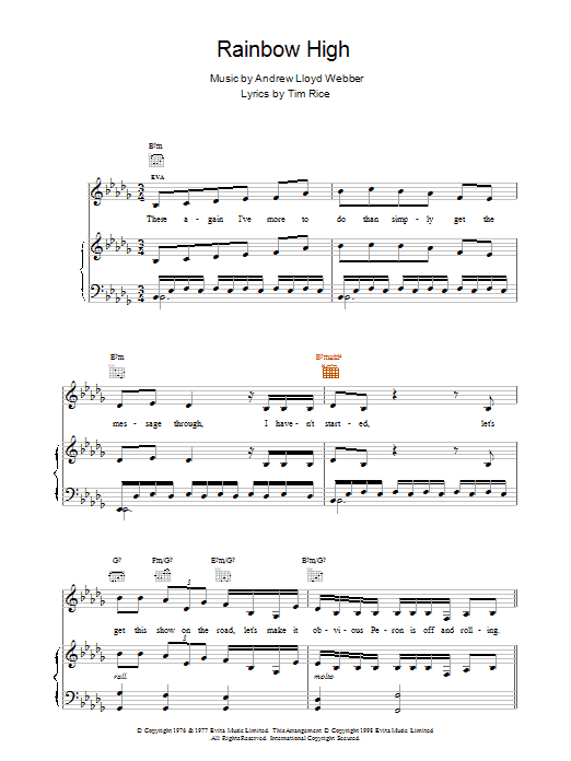 Download or print Andrew Lloyd Webber Rainbow High sheet music, chords and digital score arranged for Piano, Vocal & Guitar Chords. This Film/TV score includes 6 page(s).