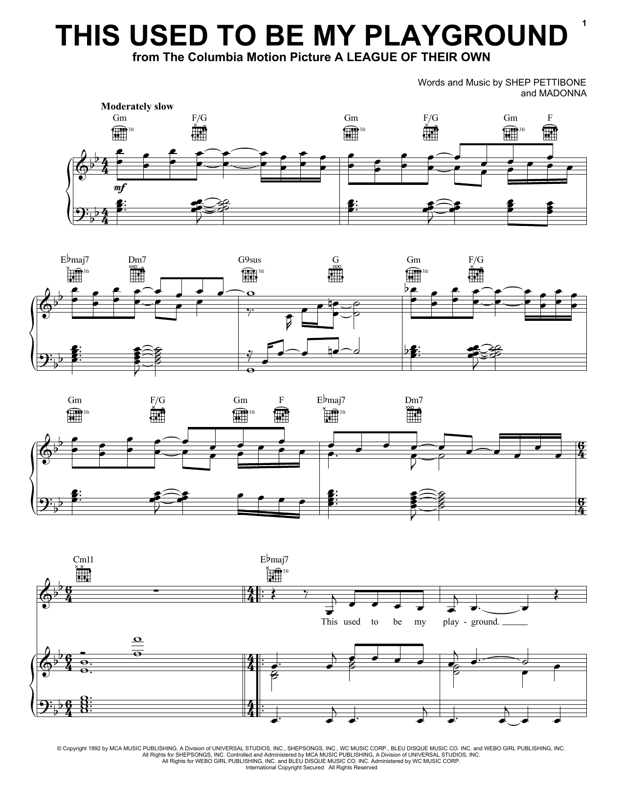 Download or print Madonna This Used To Be My Playground sheet music, chords and digital score arranged for Piano, Vocal & Guitar Chords (Right-Hand Melody). This Pop score includes 5 page(s).