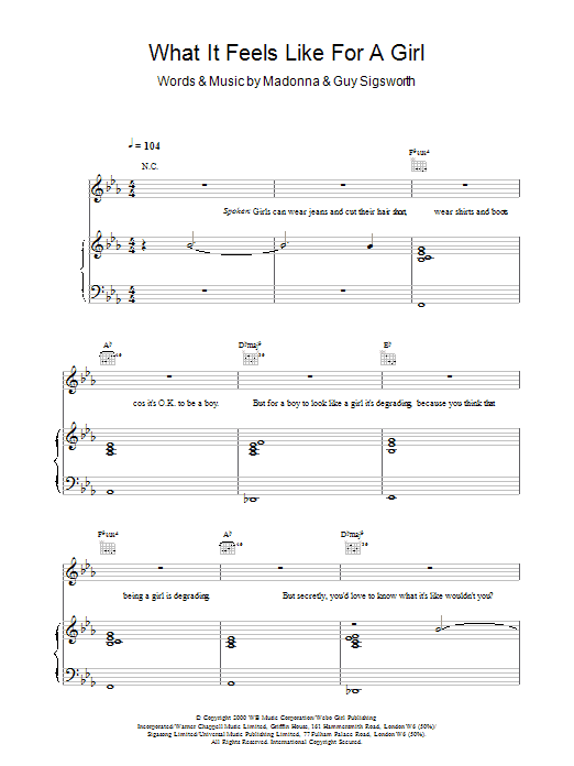 Download or print Madonna What It Feels Like For A Girl sheet music, chords and digital score arranged for Piano, Vocal & Guitar Chords (Right-Hand Melody). This Film/TV score includes 6 page(s).