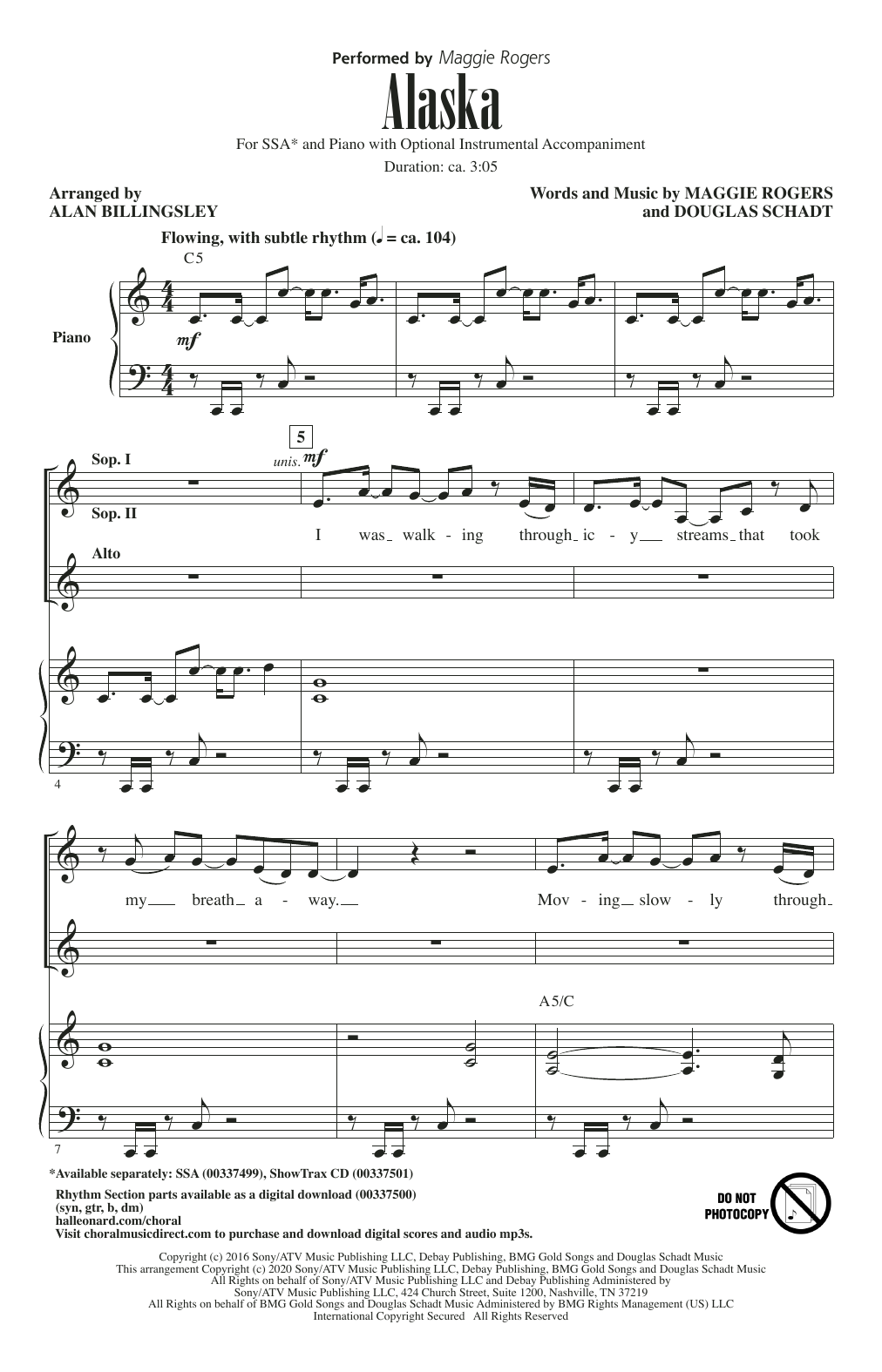 Download or print Maggie Rogers Alaska (arr. Alan Billingsley) sheet music, chords and digital score arranged for SSA Choir. This Pop score includes 10 page(s).