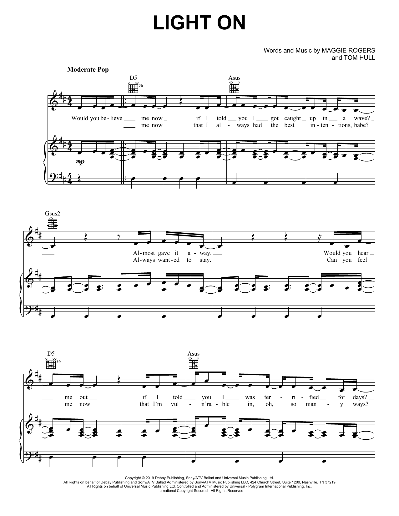 Download or print Maggie Rogers Light On sheet music, chords and digital score arranged for Piano, Vocal & Guitar Chords (Right-Hand Melody). This Pop score includes 6 page(s).