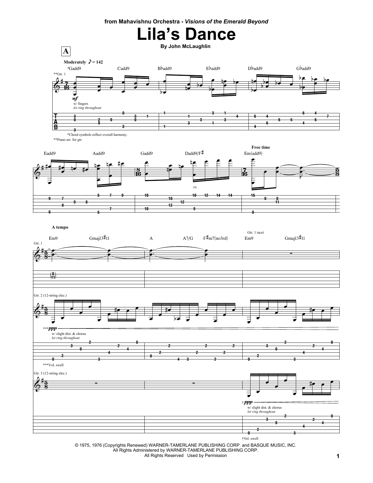 Download or print Mahavishnu Orchestra Lila's Dance sheet music, chords and digital score arranged for Guitar Tab. This Jazz score includes 7 page(s).