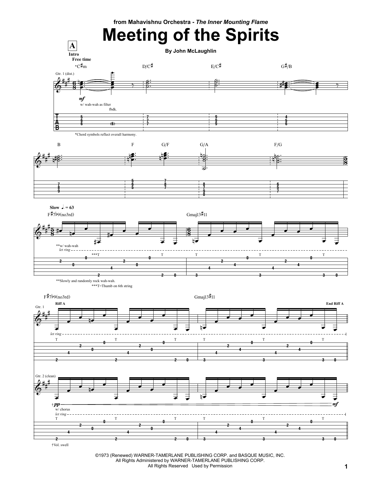 Download or print Mahavishnu Orchestra Meeting Of The Spirits sheet music, chords and digital score arranged for Guitar Tab. This Jazz score includes 13 page(s).