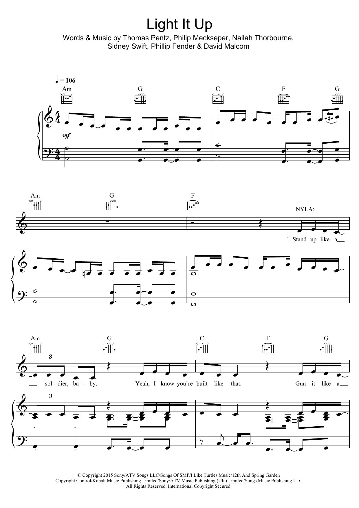 Download or print Major Lazer Light It Up (featuring Nyla and Fuse ODG) sheet music, chords and digital score arranged for Piano, Vocal & Guitar Chords. This Pop score includes 9 page(s).