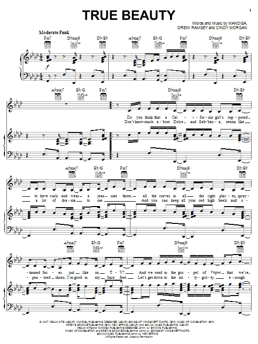 Download or print Mandisa True Beauty sheet music, chords and digital score arranged for Piano, Vocal & Guitar Chords (Right-Hand Melody). This Christian score includes 6 page(s).