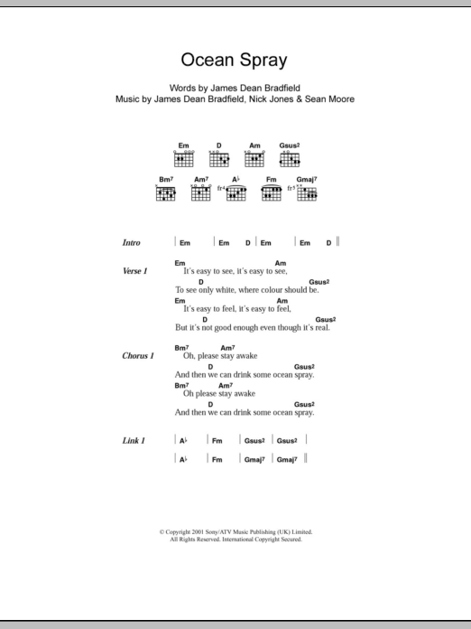 Download or print Manic Street Preachers Ocean Spray sheet music, chords and digital score arranged for Guitar Chords/Lyrics. This Rock score includes 2 page(s).